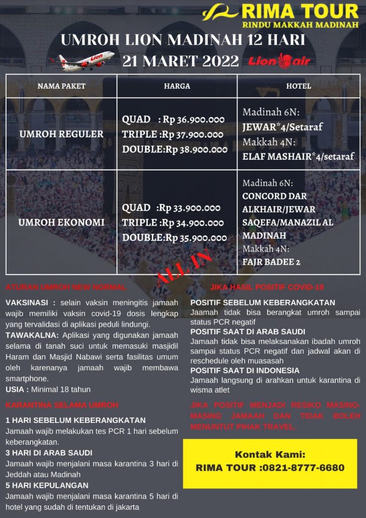 Biro Umroh Semarang – Kami agen umroh semarang, rima tour menyediakan paket UMROH 12 HARI LANDING MADINAH BY LION AIR dengan fasilitas :